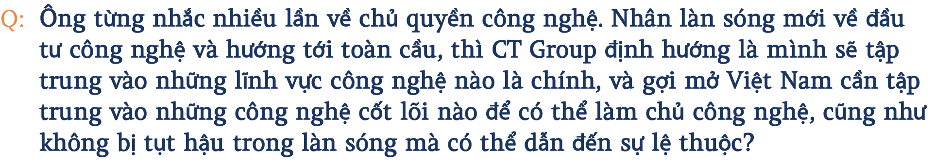 Chúng tôi đang ấp ủ để đề xuất một chương trình kéo dài 20 năm, gọi là Doanh nghiệp Việt Nam Go – Global, tiến ra thế giới bằng khoa học công nghệ, đổi mới sáng tạo và chuyển đổi số. Để đến 2045 khi đất nước tròn 100 năm độc lập, Việt Nam sánh ngang vai với các cường quốc 5 châu, trở thành một trong những quốc gia top 10 của thế giới về công nghệ và đổi mới sáng tạo.